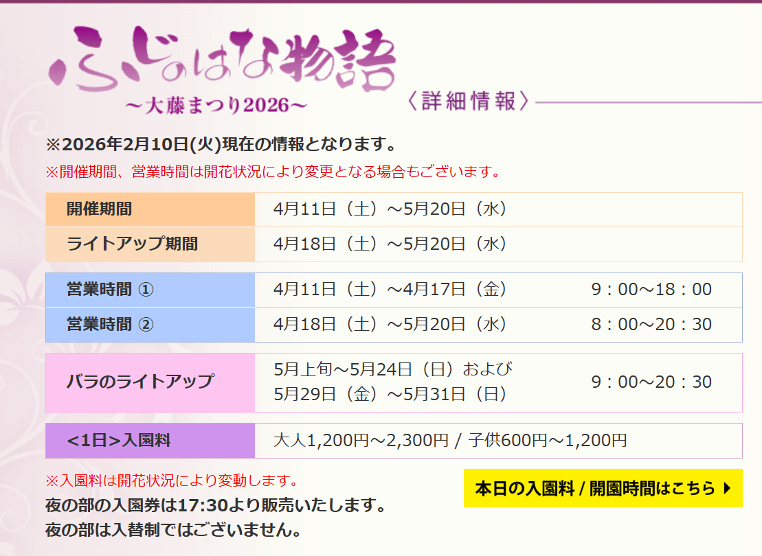 まずは、GW期間中に開催されているあしかがフラワーパーク「大藤まつり2026」の概要をご紹介したいと思います。